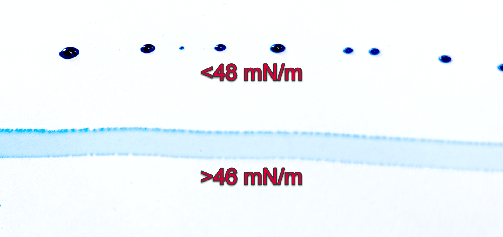 [Determining the surface tension per tint line with BOPP, here the result is ≥46 mN/m]